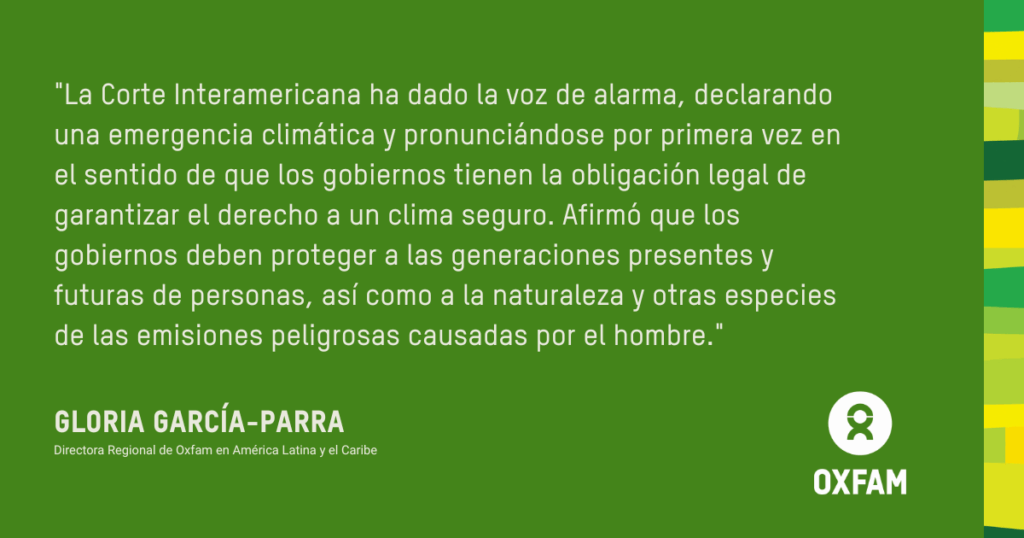 En respuesta a la decisión de hoy de la Corte Interamericana de Derechos Humanos, que establece las obligaciones de los gobiernos frente a la crisis climática, Gloria García-Parra, directora regional de Oxfam para América Latina y el Caribe, declaró: