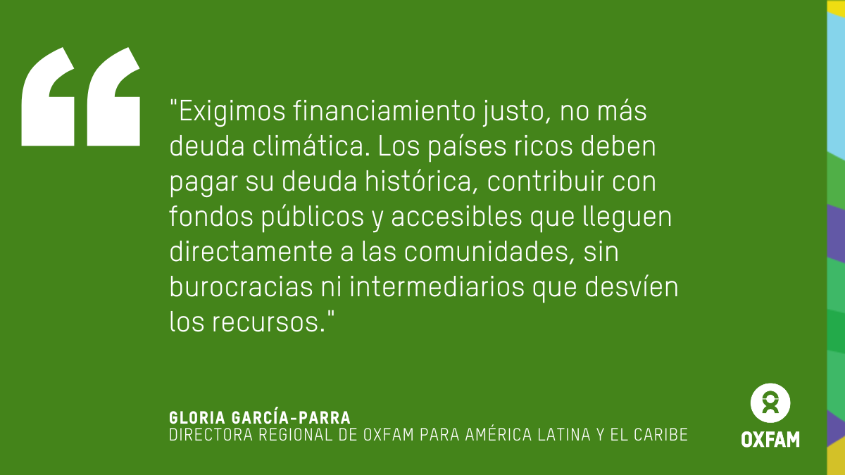 “Las mujeres indígenas, afrodescendientes y campesinas son las más afectadas por esta crisis múltiple y, a la vez, son las que lideran las alternativas reales. Sin embargo, son sistemáticamente excluidas de las decisiones y los beneficios”, añadió Viviana Santiago, directora de Oxfam Brasil.