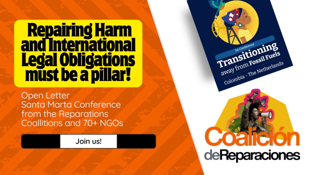 Carta Abierta para la Primera Conferencia sobre la Transición hacia el Abandono de los Combustibles Fósiles, la Coalición de Reparacipones y más de 70 organizaciones no gubernamentales levantamos la voz para que esta conferencia incorpore de manera explícita responsabilidad legal internacional y las reparaciones del daño climático a nuestro derecho humano a un clima saludable, dimensiones que no se reflejan con suficiente claridad en la nota conceptual.