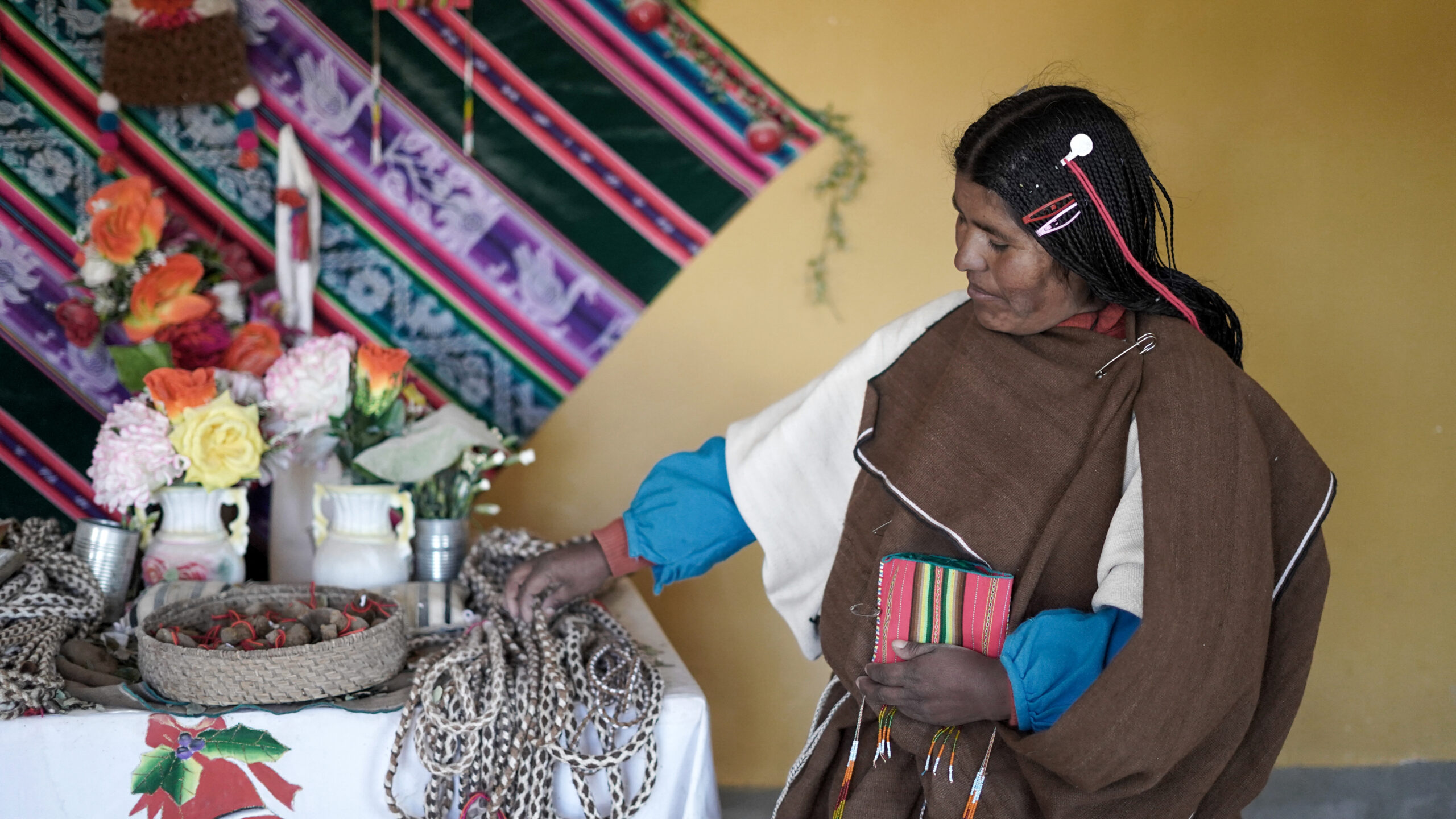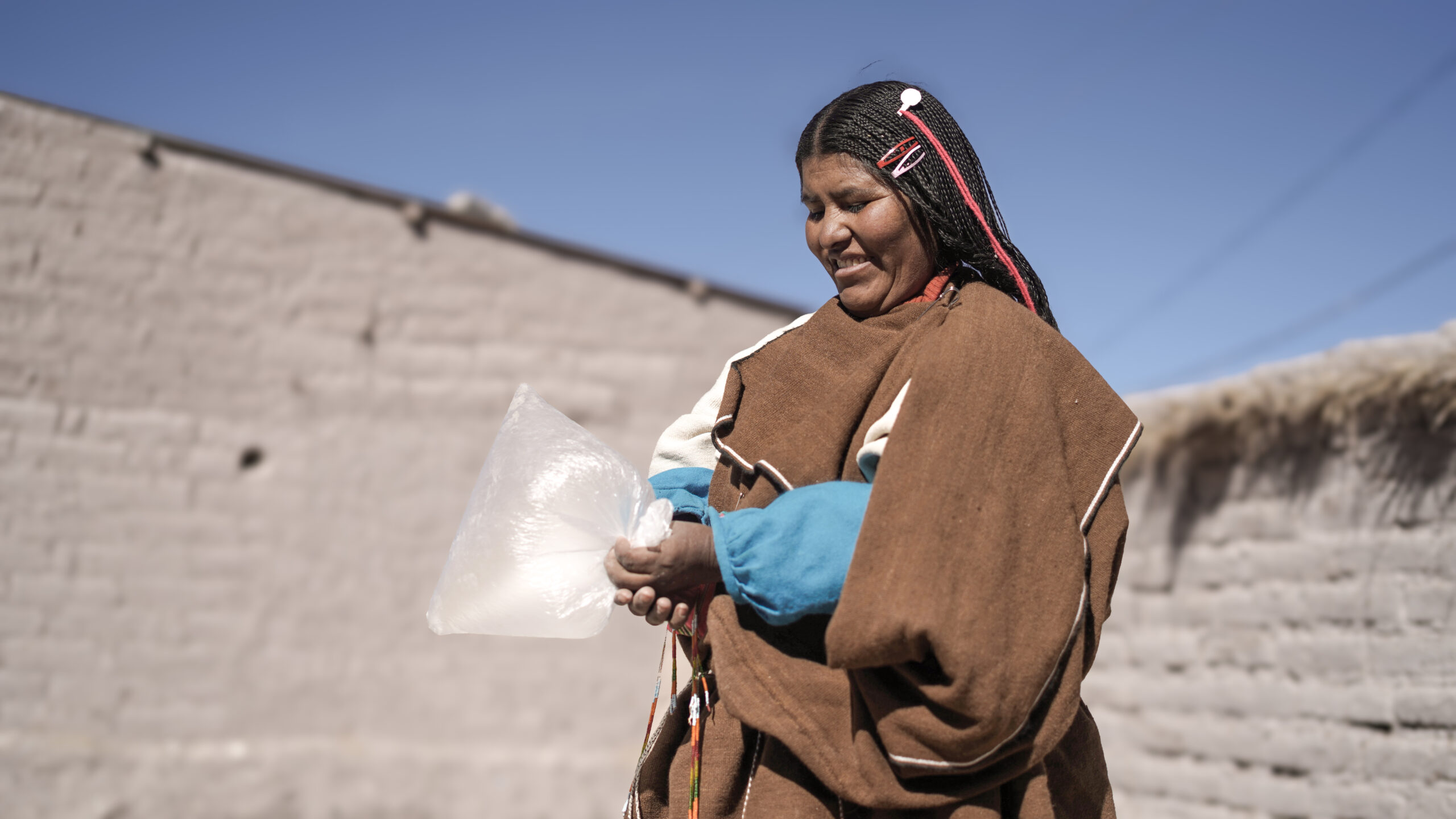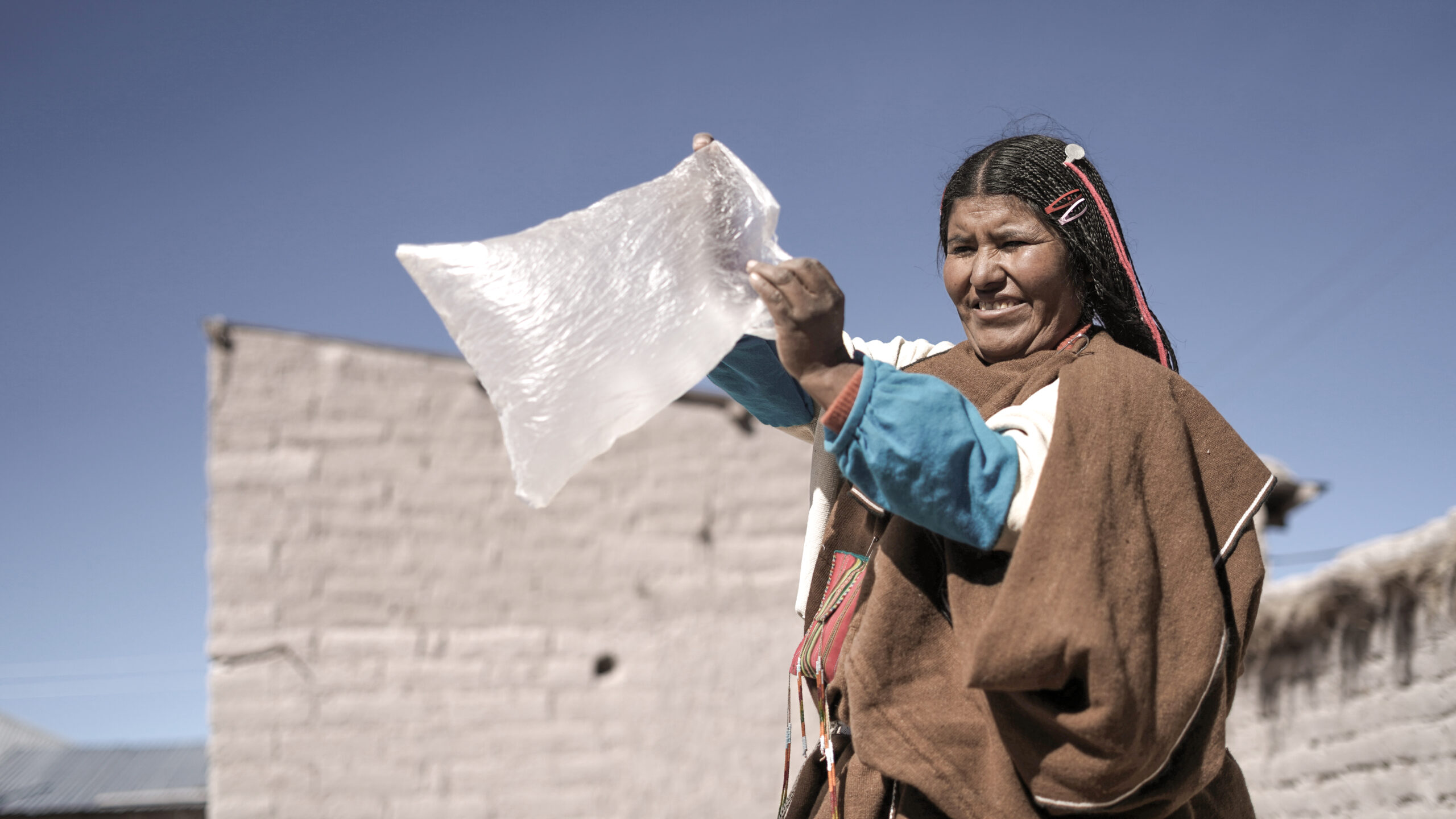 Las Chipaya no se quedan con los brazos cruzados frente a los cambios climáticos, que dificulta muchísimo la vida en su territorio. Emiliana cuenta sobre los rituales para calmar el clima: “Cuando hace viento agarramos el viento, es costumbre, en una bolsa de nylon. Y la colgamos en la oficina porque el viento es bien travieso. Esta costumbre tenemos cuando está haciendo mucho viento. Y cuando no hay lluvia, llamamos para que venga la lluvia. Venga, venga… (dice en su idioma Uru Chipaya) y s¡i viene la lluvia. Cuando está lloviendo mucho, despachamos también la lluvia. Eso hacen los que cuidan las chacras de quinua,” cuenta Emiliana.