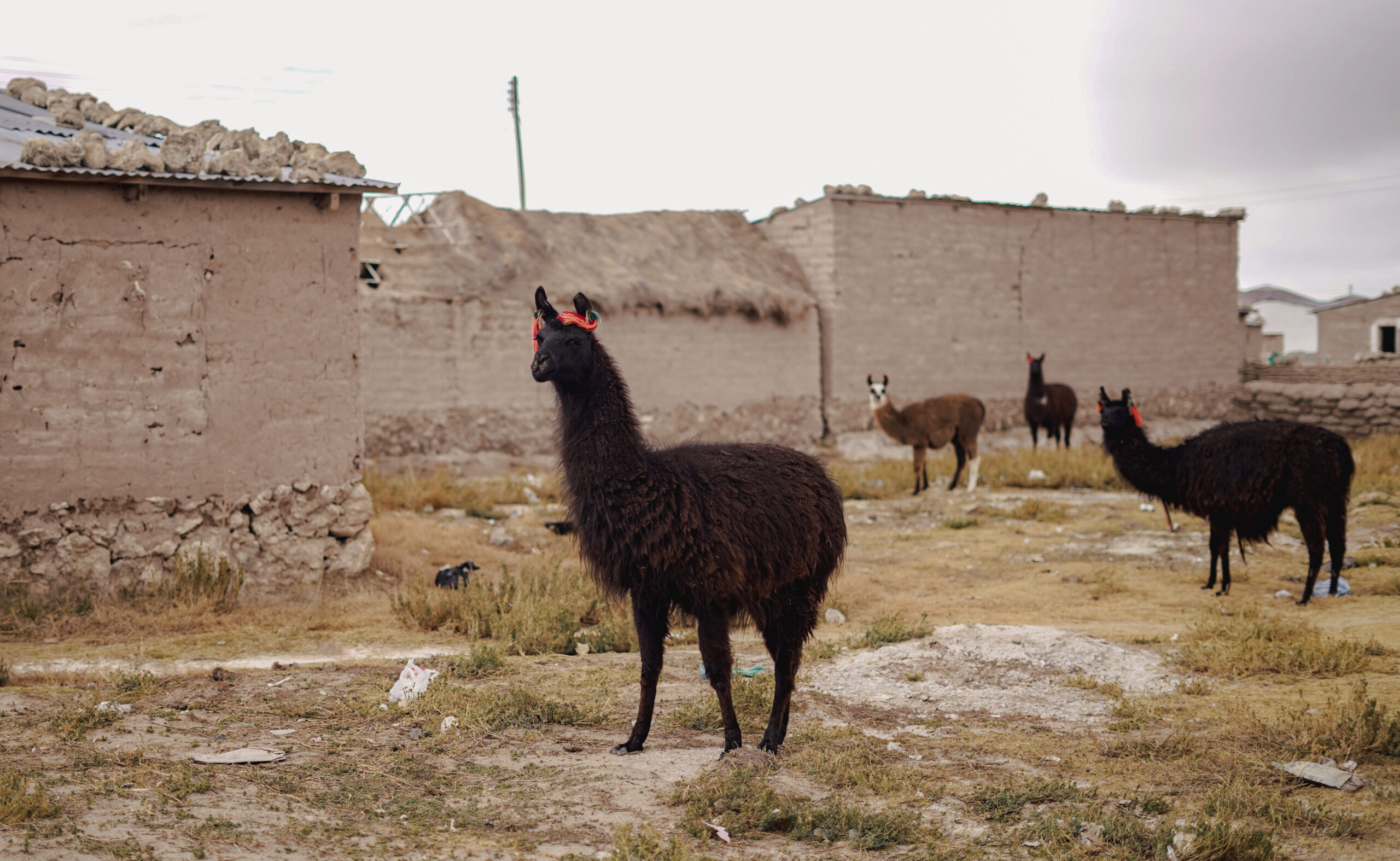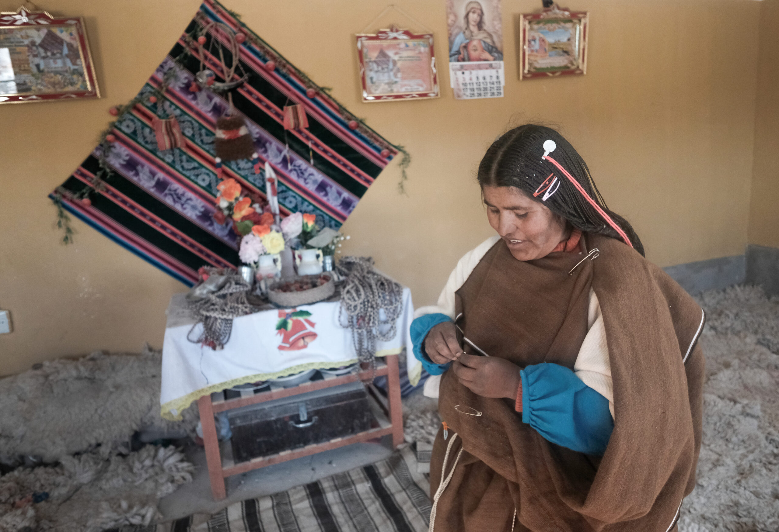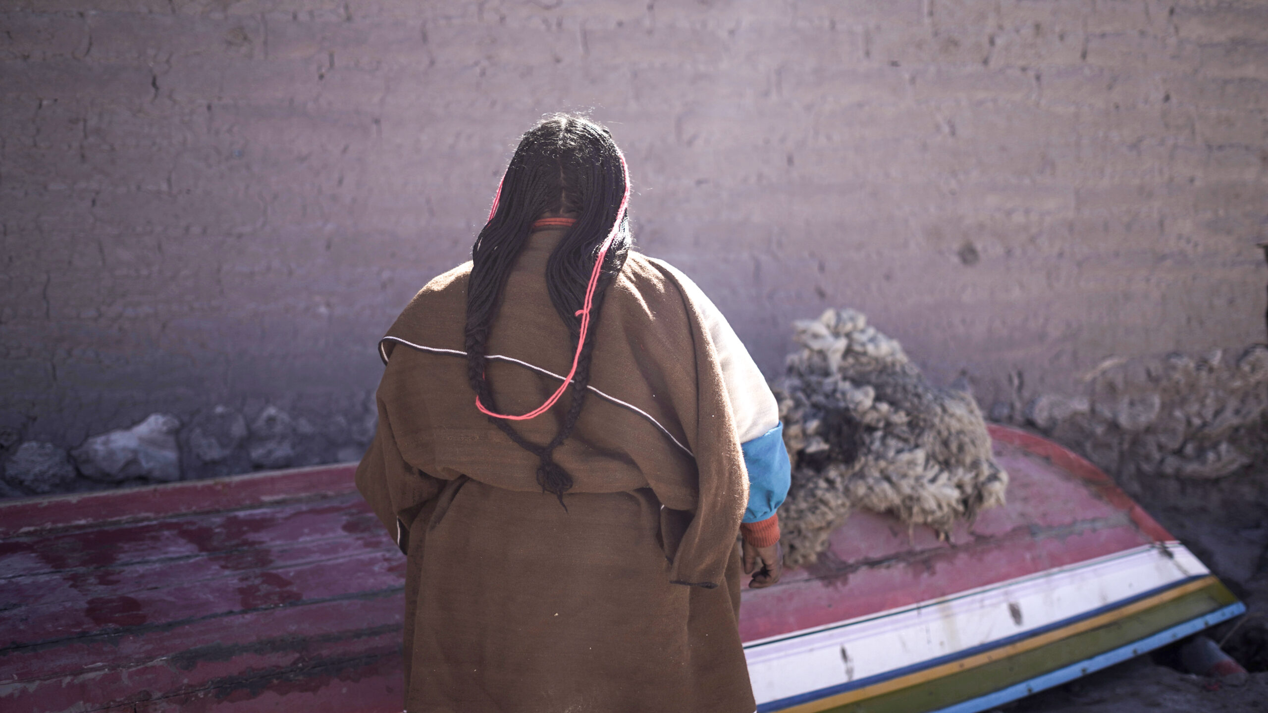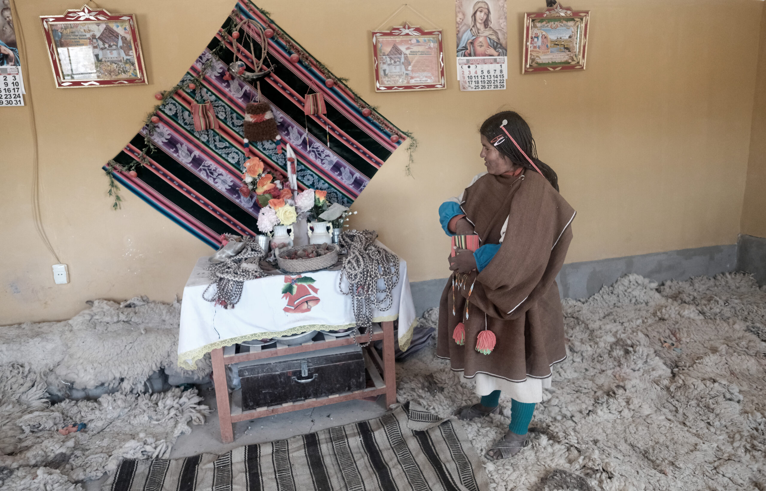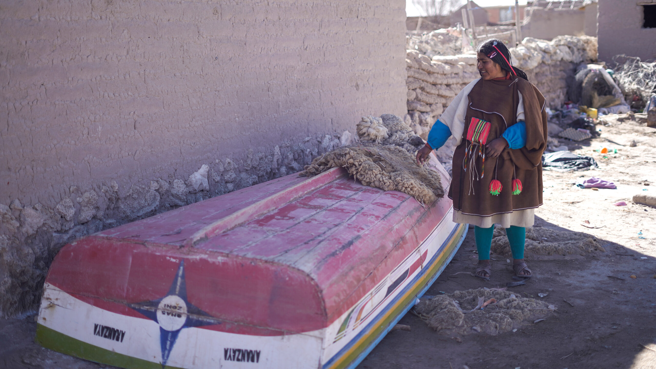 Otra de las mujeres autoridades de la comunidad es Emiliana Alave Quispe de 37 años que es Mama Tálla de Aranzaya. Su mama es quizá la Chipaya más famosa de la historia como actriz del semi-documental “Vuelve Sebastiana” del año 1953 cuando su mama Sebastiana tenia 10 años. A lado de la casa de Emiliana encontramos un pequeño bote escena que parece absurdo con estas tierras tan secas, en este lugar tan abstente de agua. Pero hace pocos meses atrás se inundó Chipaya y este bote era un medio de transporte importante. “Con las inundaciones han sufrido grave los animales por el pasto. A veces mueren también los animalitos. Y casi toda la quinua se ha perdido en Chipaya. Caro es arroz y fideo. Fuerte ha pasado este año,” cuenta Emiliana. Y en otras temporadas el agua hace falta: “Ahora ha cambiado el clima, grave está helando también, todo el tiempo está helando, todo ha cambiado el clima y mucho se están enfermando los niños este año, de gripe, de tos… los niños por el frio. Este año grave es. Ahora por el viento deben estar muriendo las crías de las llamas y los corderos.”