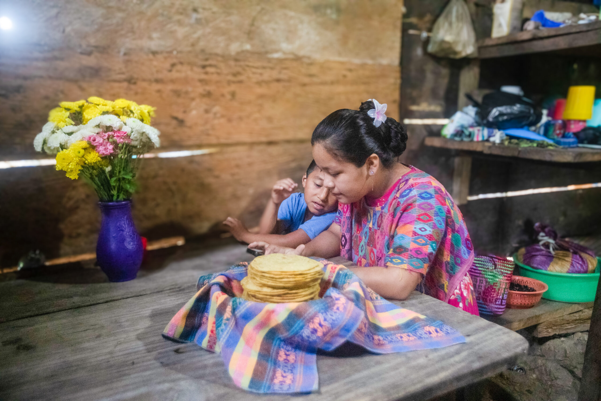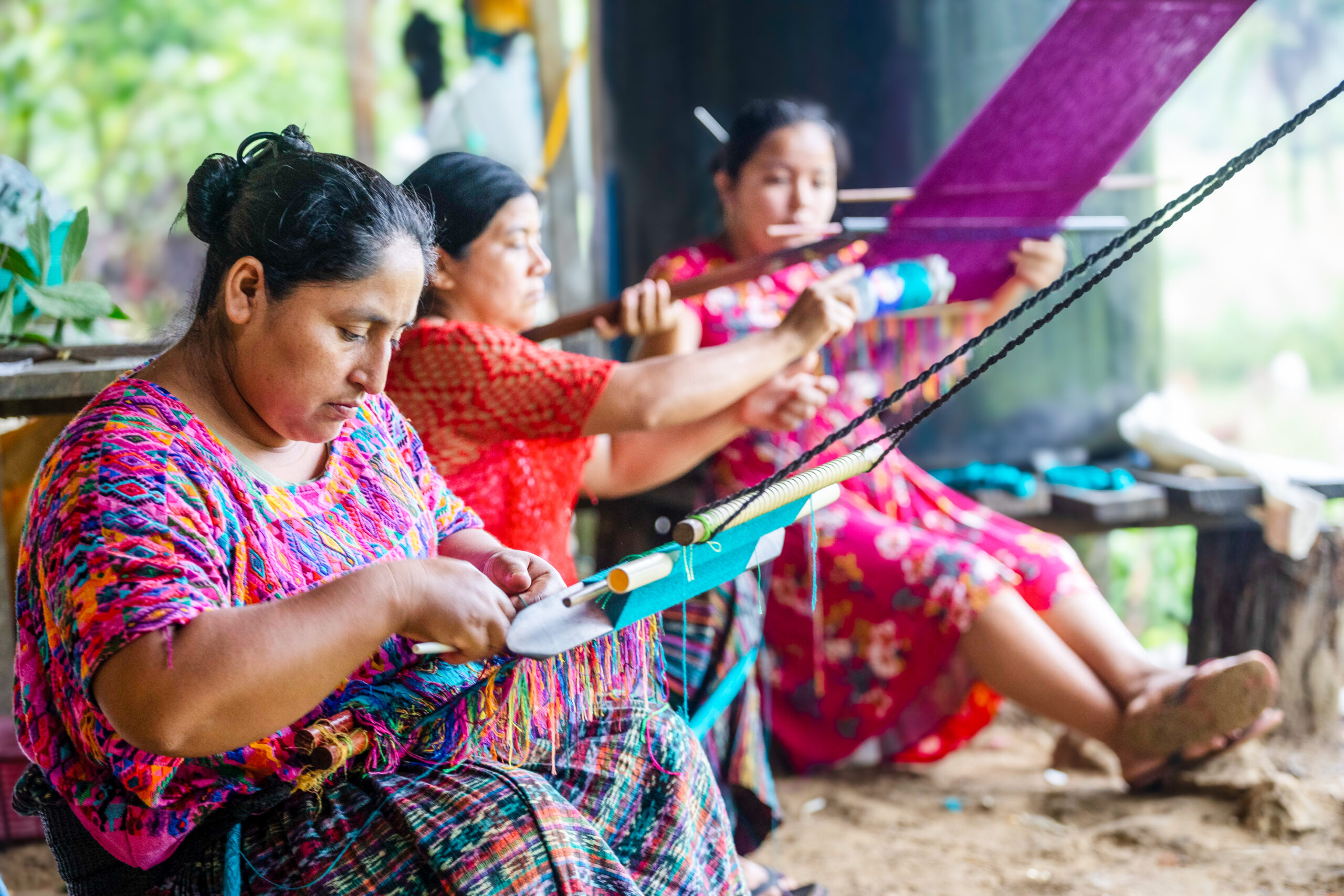 De vuelta a la casa de Susana y Ana María, se sientan a tejer sus güipiles afuera de la cocina. Como no tienen mucho espacio para cultivar, las mujeres optaron por esta otra actividad económica con apoyo de Oxfam.