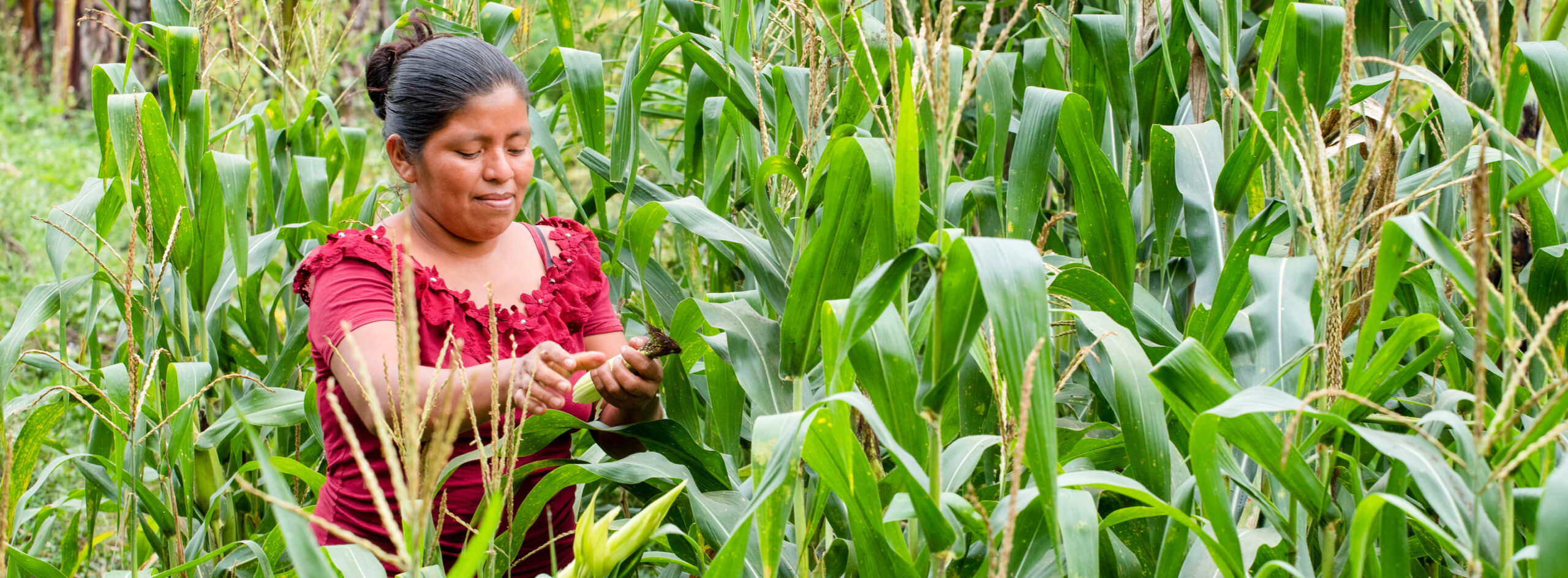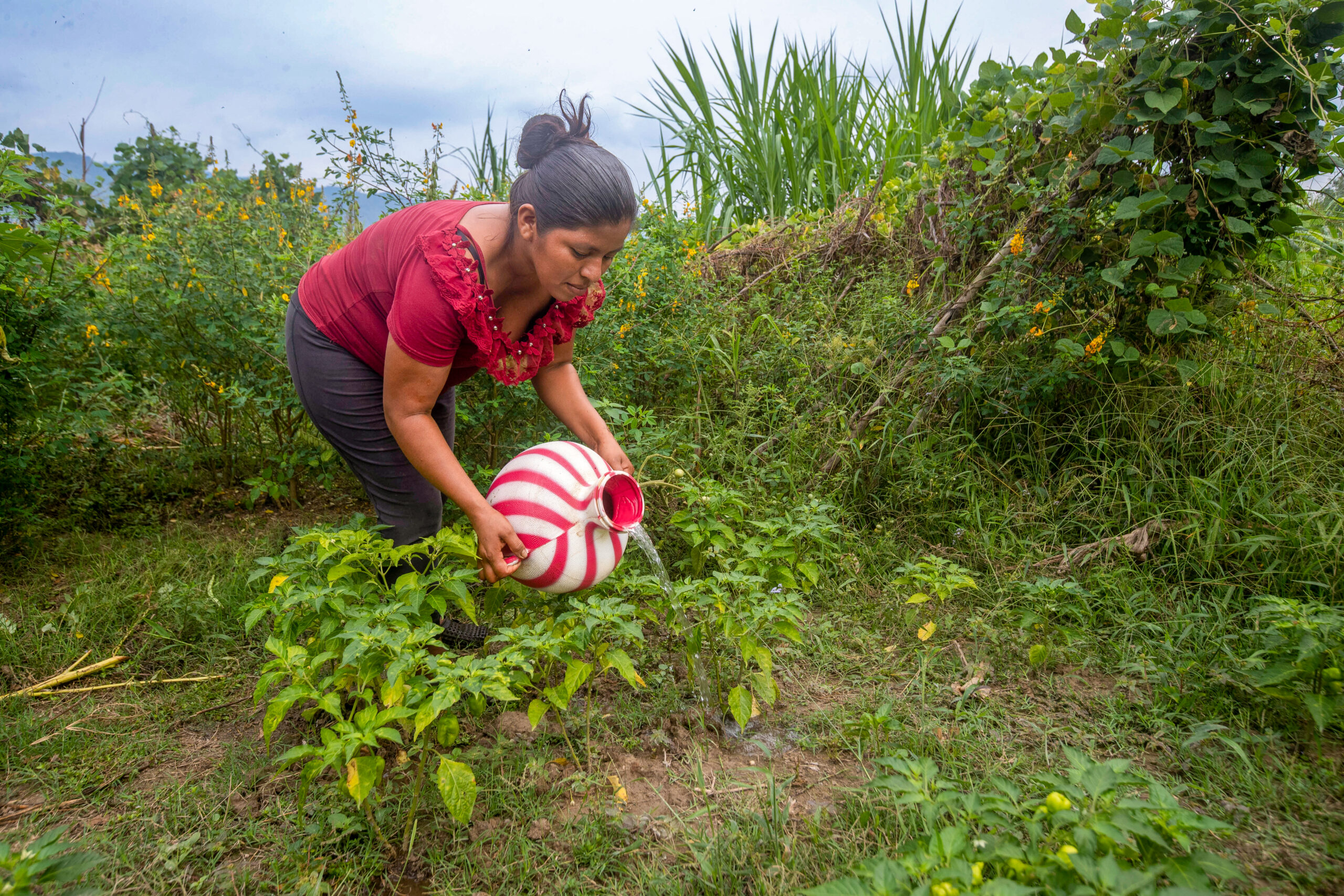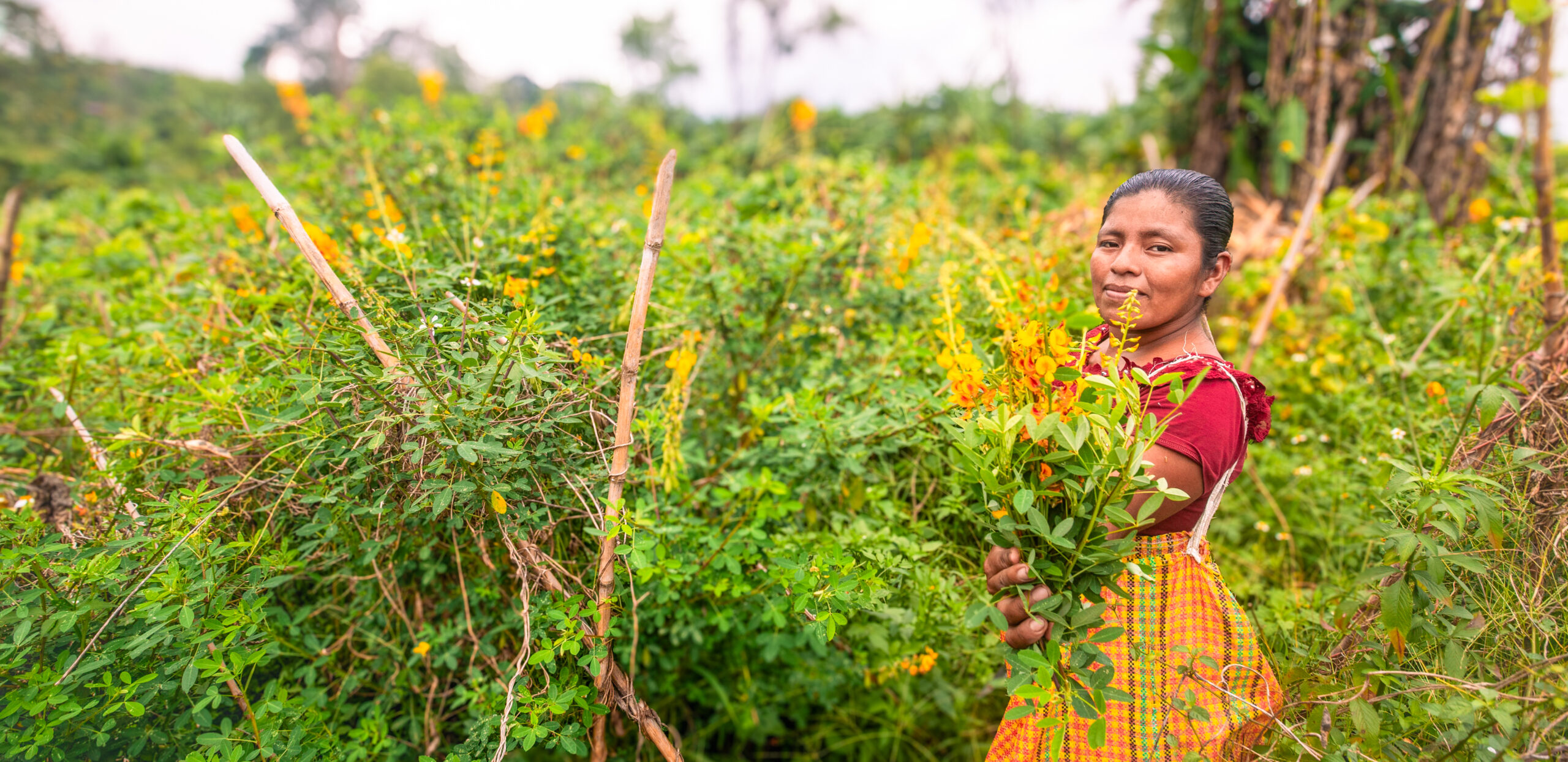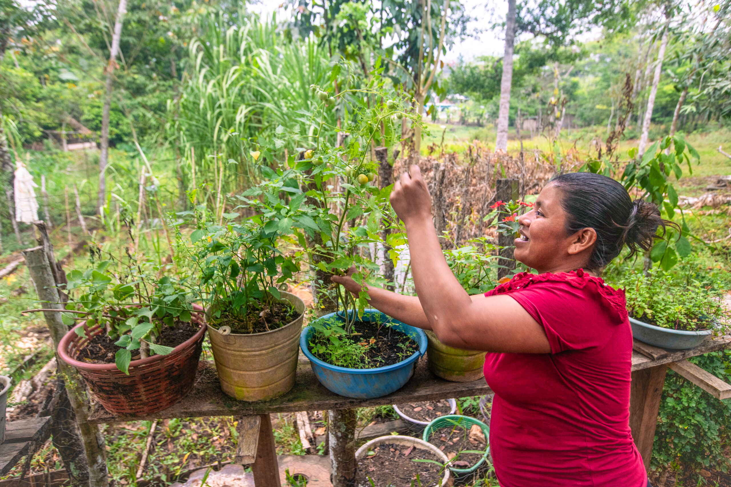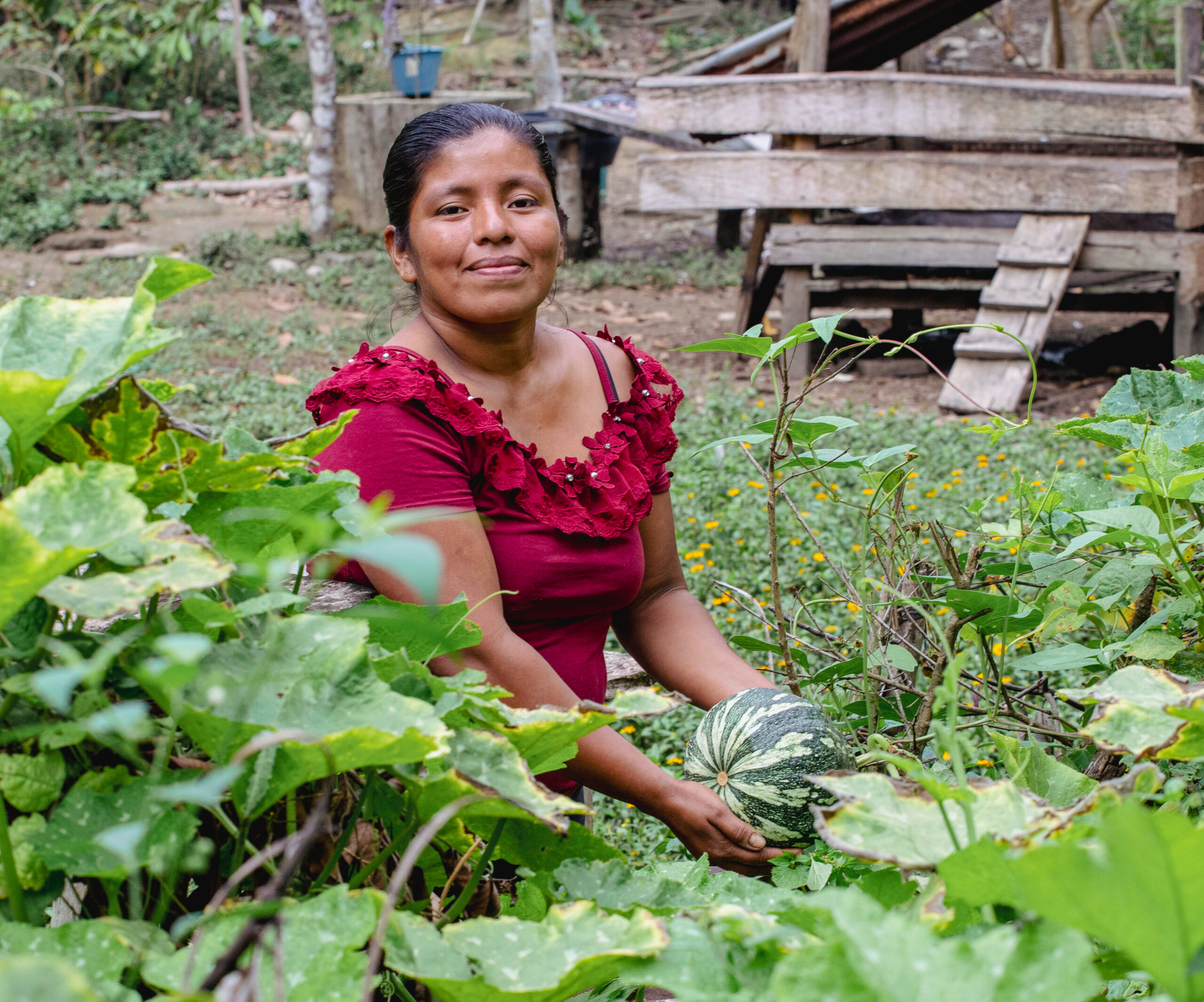 Ahora Rosa María y las otras mujeres de la comunidad tienen que caminar hasta el rio para tener el agua que necesitan para sus familias y los cultivos: “Es fuerte para nosotras las mujeres ir a buscar agua lejos de casa,” – cuenta sobre la tarea diaria. La acompañamos al rio a ver sus cultivos. “Mira este plátano esta grande,” – dice emocionada y visiblemente orgullosa de sus plantas. Se pone a cosechar un poco de Chipilin, una hierba con lindas flores amarillas, que justo alguien le pidió para entregar. Pero venir aquí al rio también le trae nostalgia: “Antes había buenos terrenos aquí. Pero con las tormentas Iota y Eta (huracanes – ambos en 2020) toda la gente perdió sus cultivos. El rio se llevó todo,” se acuerda Rosa María con pena.