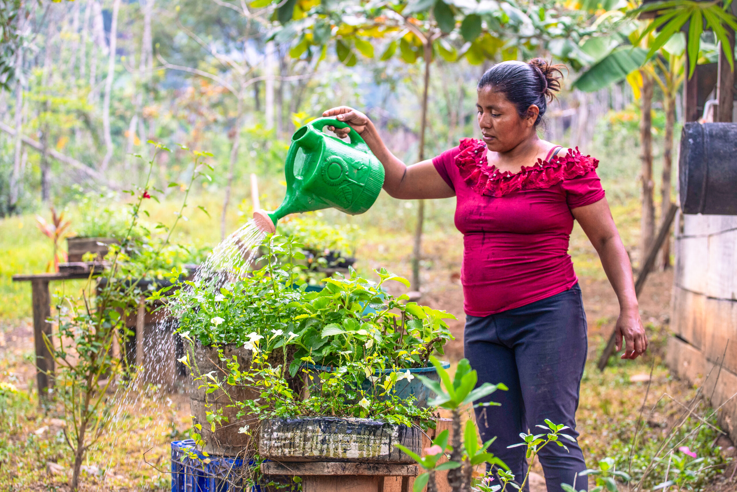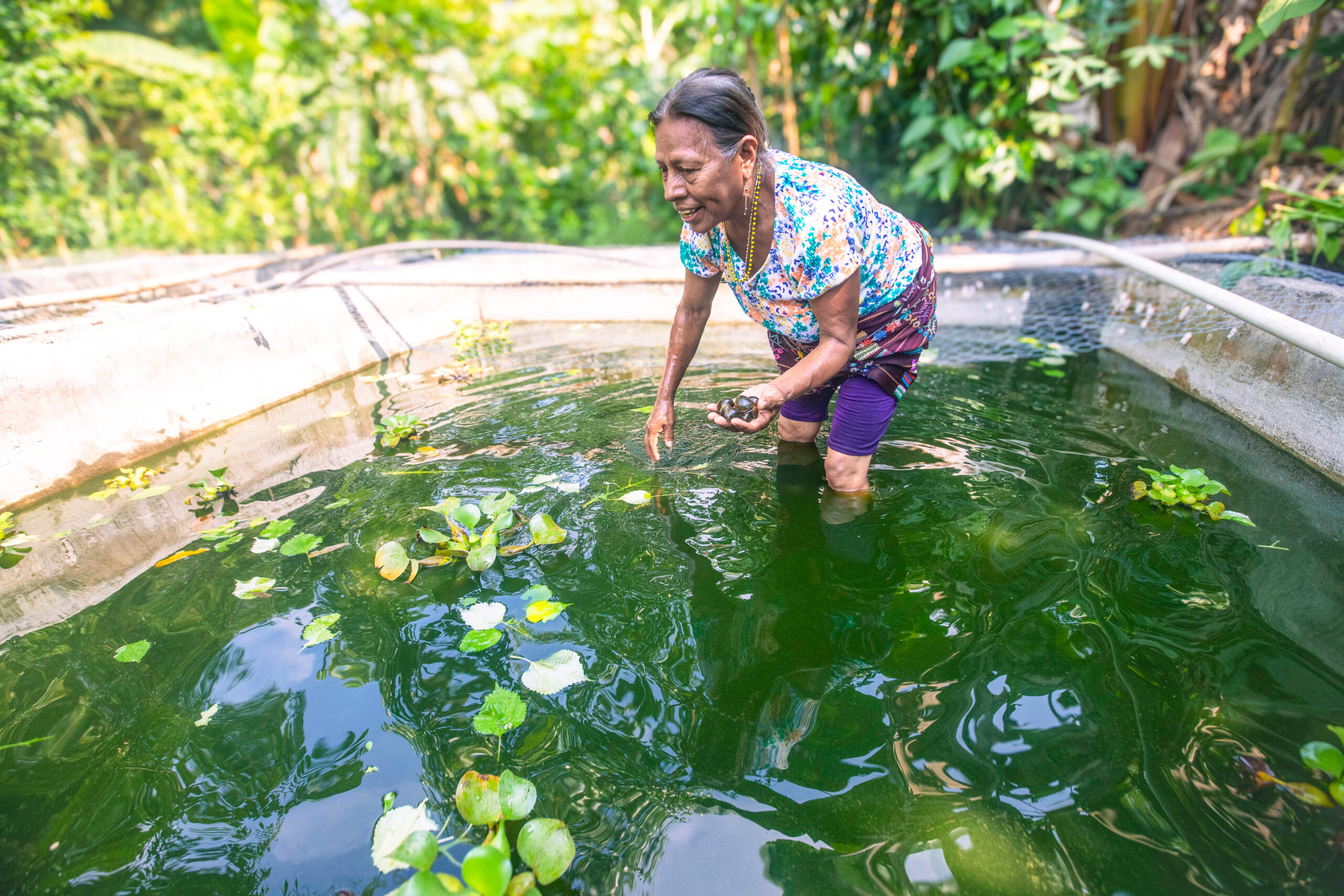 Para ella también sus recuerdos se distinguen por los huracanes: “Iota nos perjudicó bastante, bastante. En las orillas del Rio Xalbal se anuló todo lo que fue la siembra de maíz y frijol. Se hundió todo, todo. Yo también tenía maíz ahí y se hundió. Me quedé sin comida. Y no encontramos agua tampoco, tuvimos que ir hasta otro rio buscando agua. Y después de Iota tuvimos un año de sequía,” recuerda Carmen. Y justamente las sequias es otra afectación de la crisis climática acá. Cada vez se presentan temperaturas más altas, y cada vez hay menos agua. Y aunque los caracoles de Carmen es una delicia codiciada, para estos tiempos ella tiene algo más deseado por todo el mundo: agua. Ha logrado planificar su lote con sombra y diversificar las plantas y árboles. Cuida su fuente de agua como un tesoro y mide con mucho cuidado su consumo de agua para la casa, los caracoles y los cultivos. “Toda la gente me dice, “¿Cuánto es?” No le digo. Yo voluntaria estoy dando el agua. Ah, bueno, dicen. Y, me traen maíz, frijol, o un poco de arroz. O me traen un poco de jabón. Hacemos un trueque por el agua, así hay para todos”.