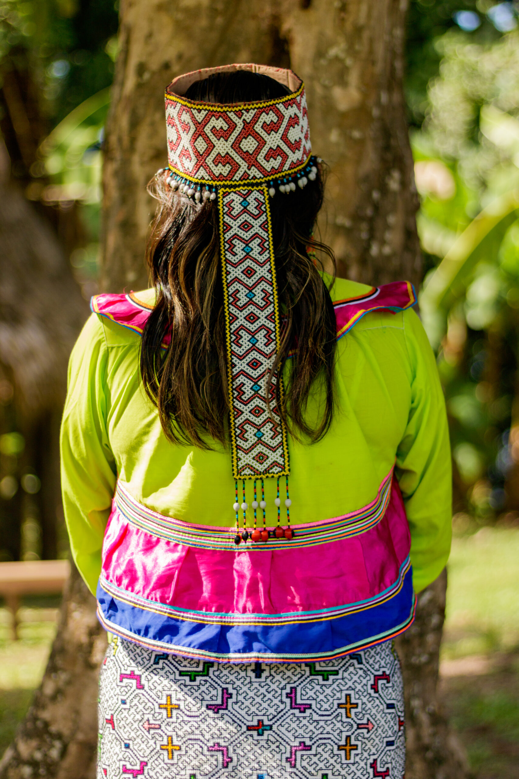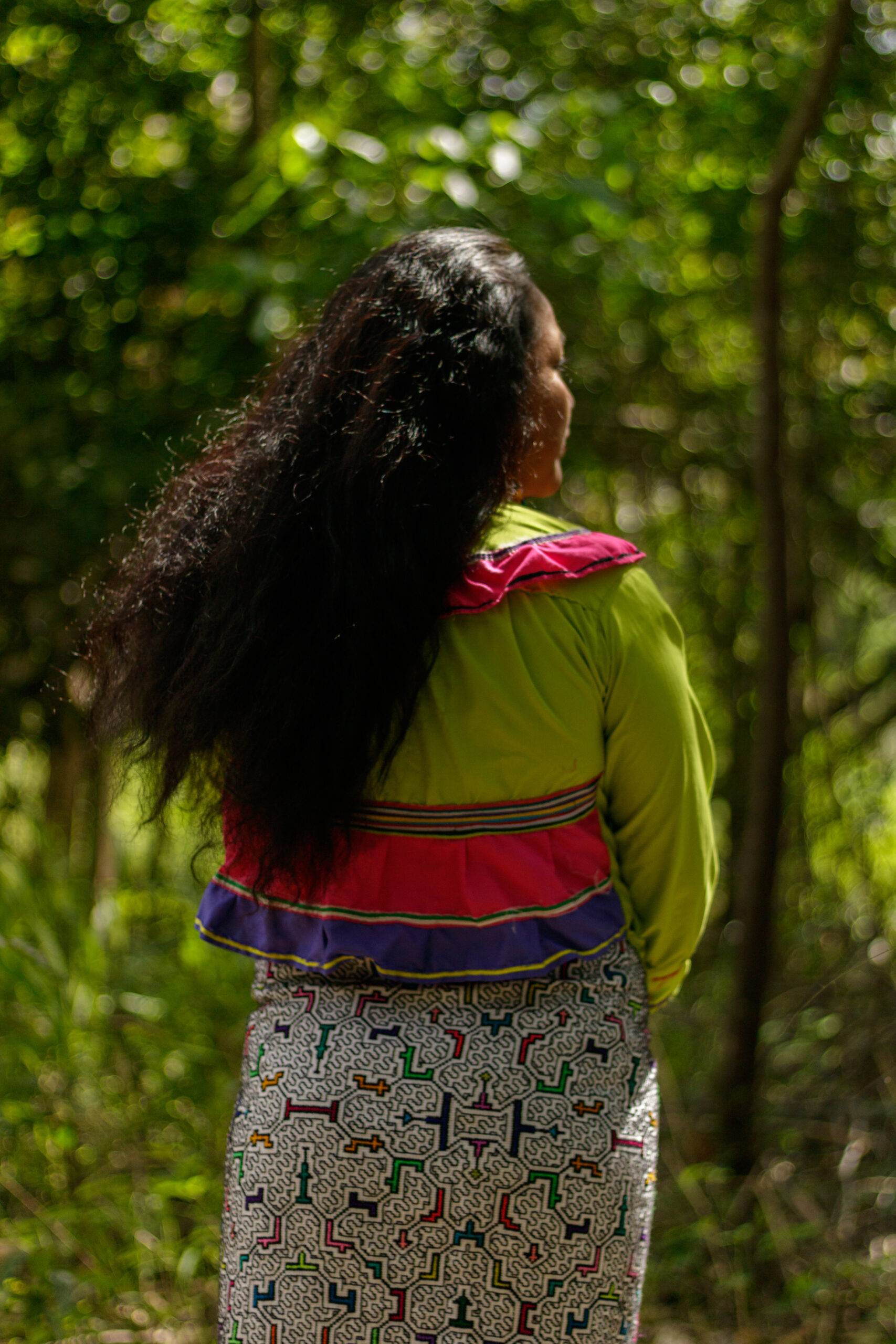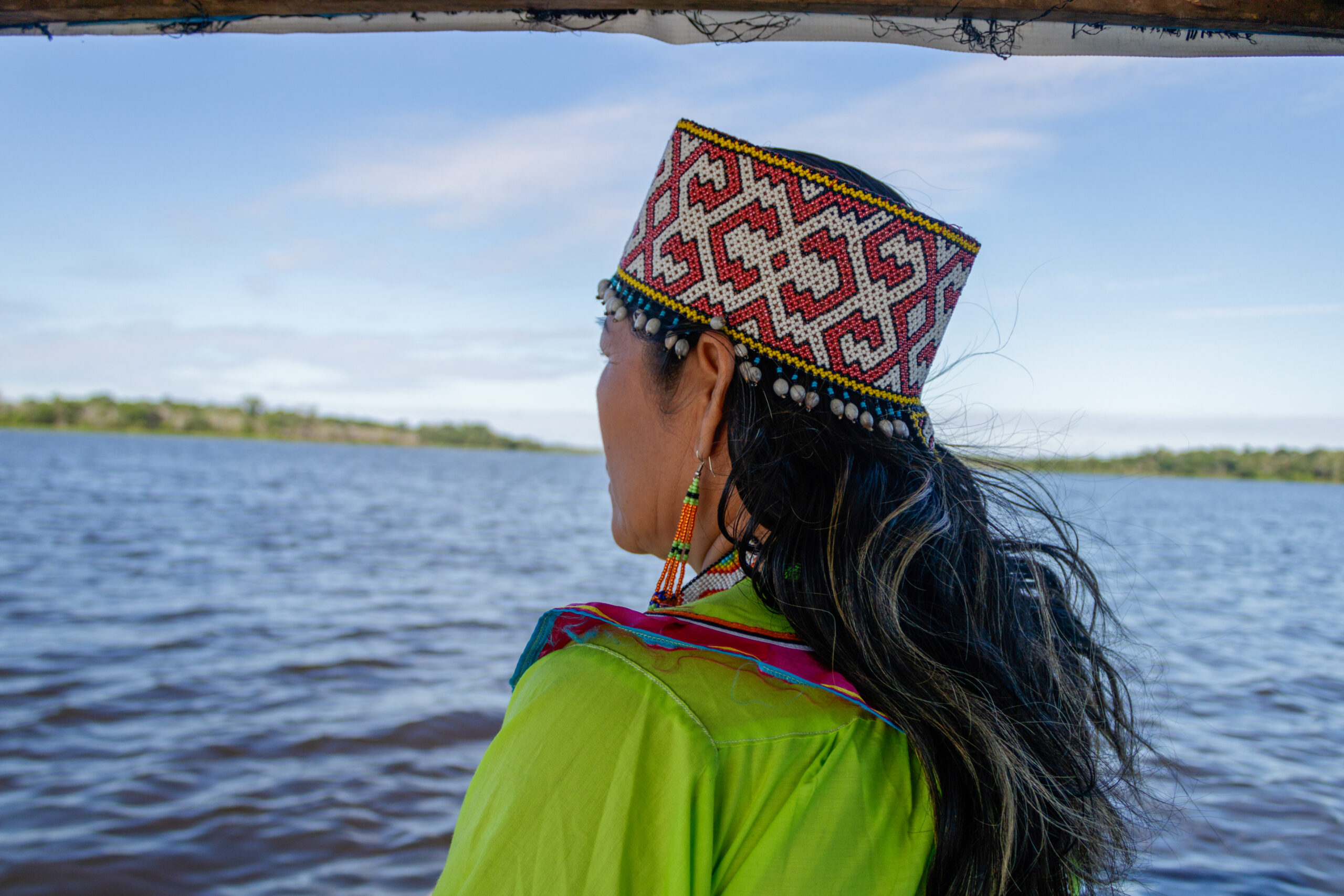 Graciela es la primera presidenta Shipiba de la organización FECONAU que representa a los 4 pueblos indígenas Asháninka, Aguajum, Shipibo-Konibo y Isconagua. Lleva vestimenta típica Shipibo y nos cuenta cómo los tejidos hablan del territorio: “En los diseños de la falda vemos las curvas, los cuadrados, son los ríos, los bosques, las cochas que tenemos. Y nosotros cuidamos nuestros bosques, nuestros territorios.