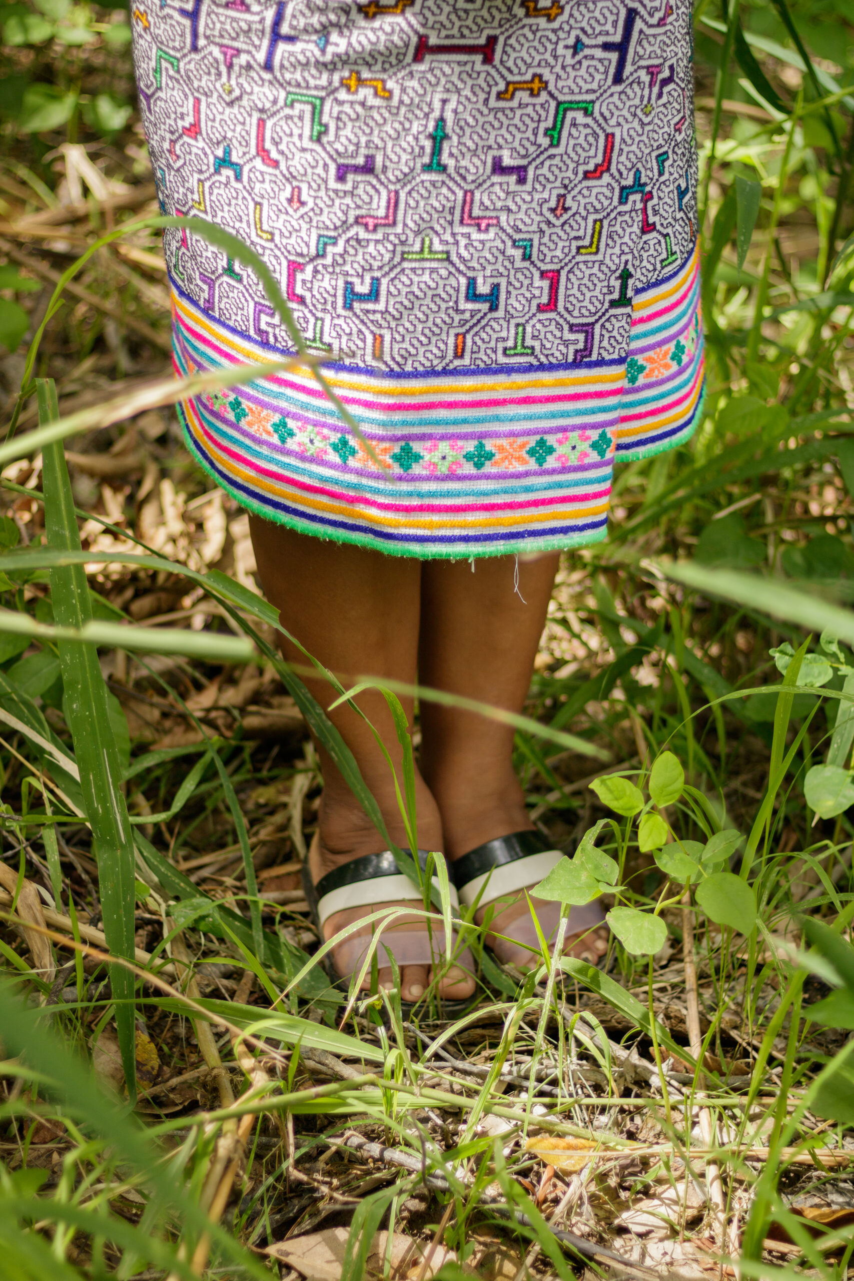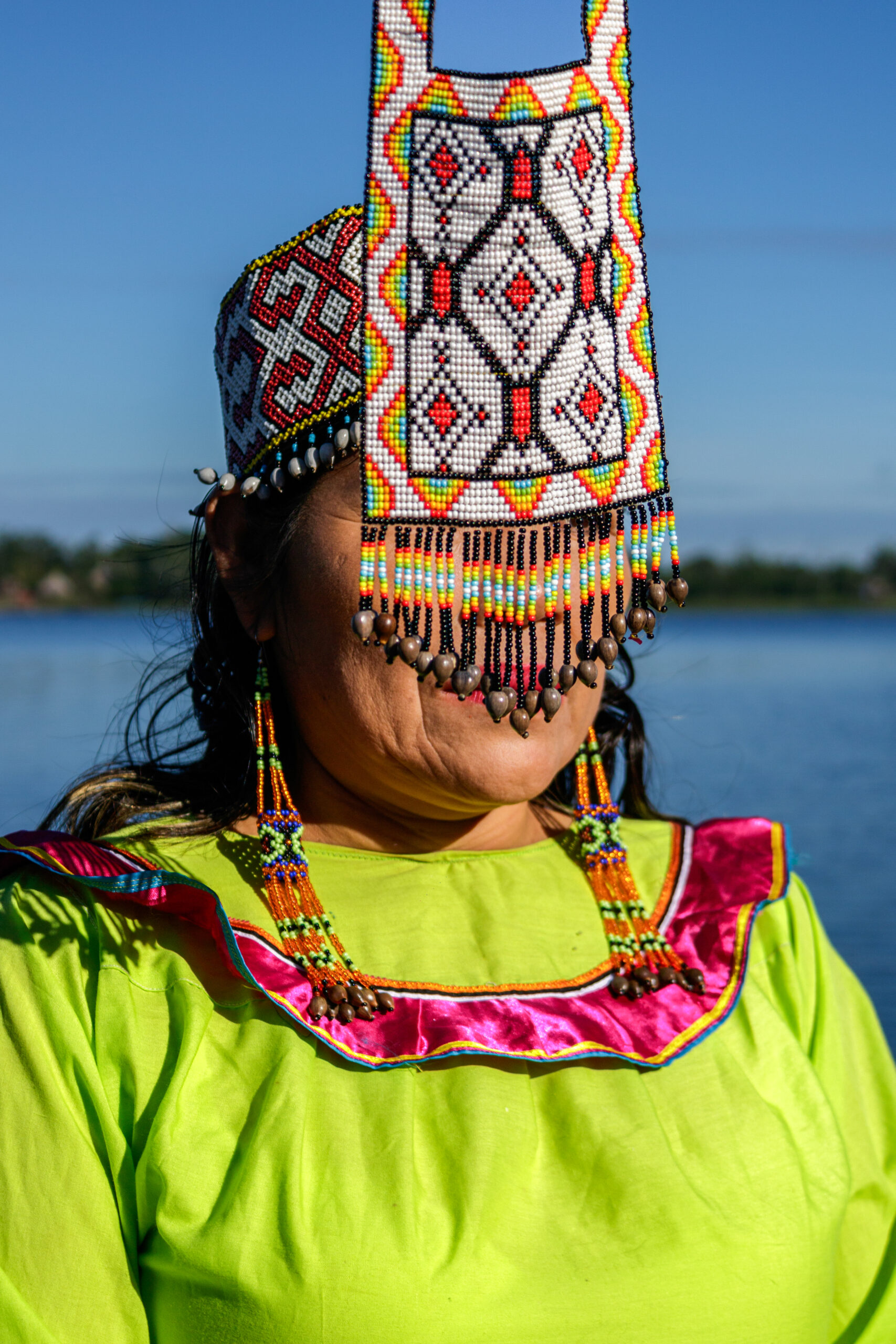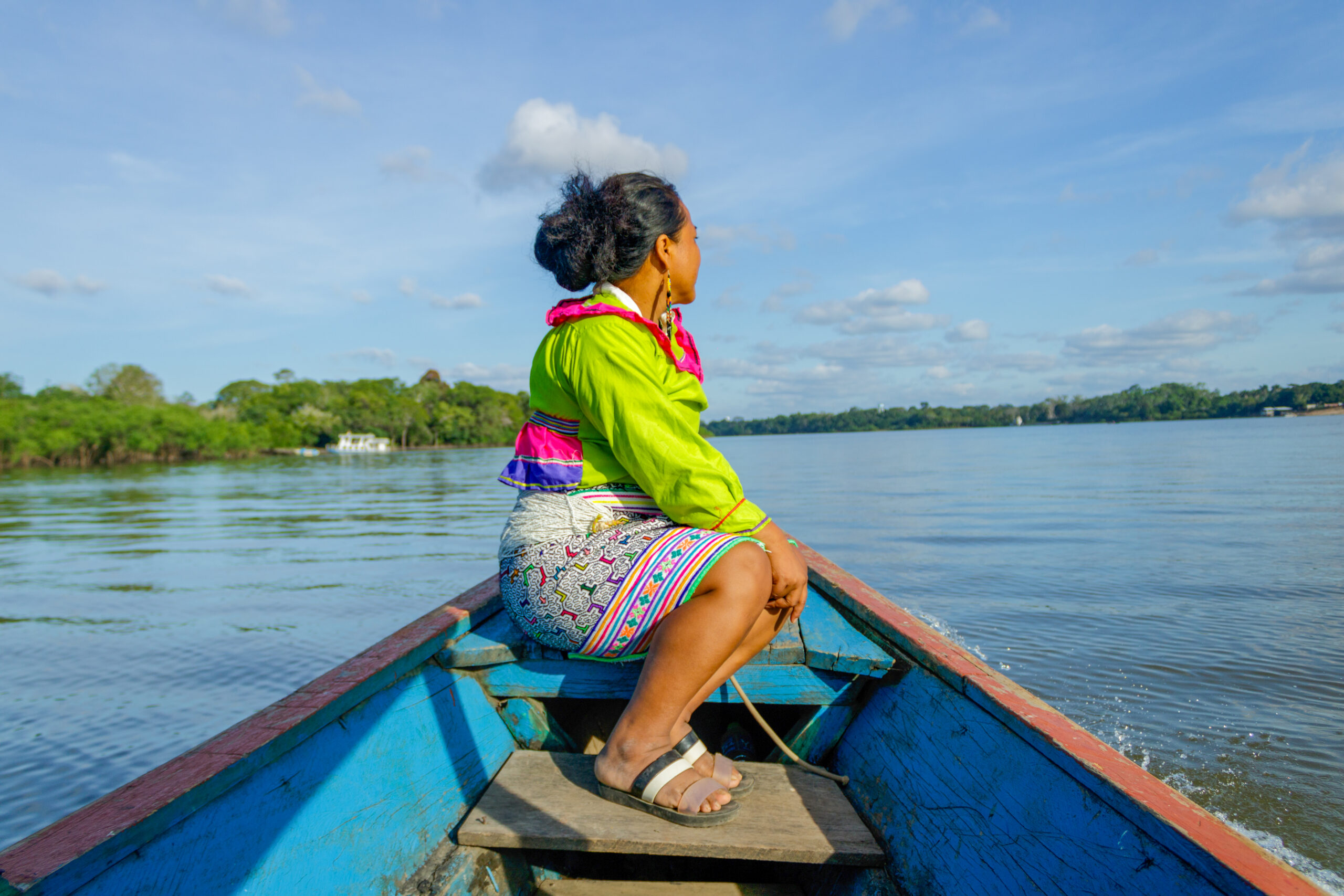Graciela es la primera presidenta Shipiba de la organización FECONAU que representa a los 4 pueblos indígenas Asháninka, Aguajum, Shipibo-Konibo y Isconagua. Lleva vestimenta típica Shipibo y nos cuenta cómo los tejidos hablan del territorio: “En los diseños de la falda vemos las curvas, los cuadrados, son los ríos, los bosques, las cochas que tenemos. Y nosotros cuidamos nuestros bosques, nuestros territorios.