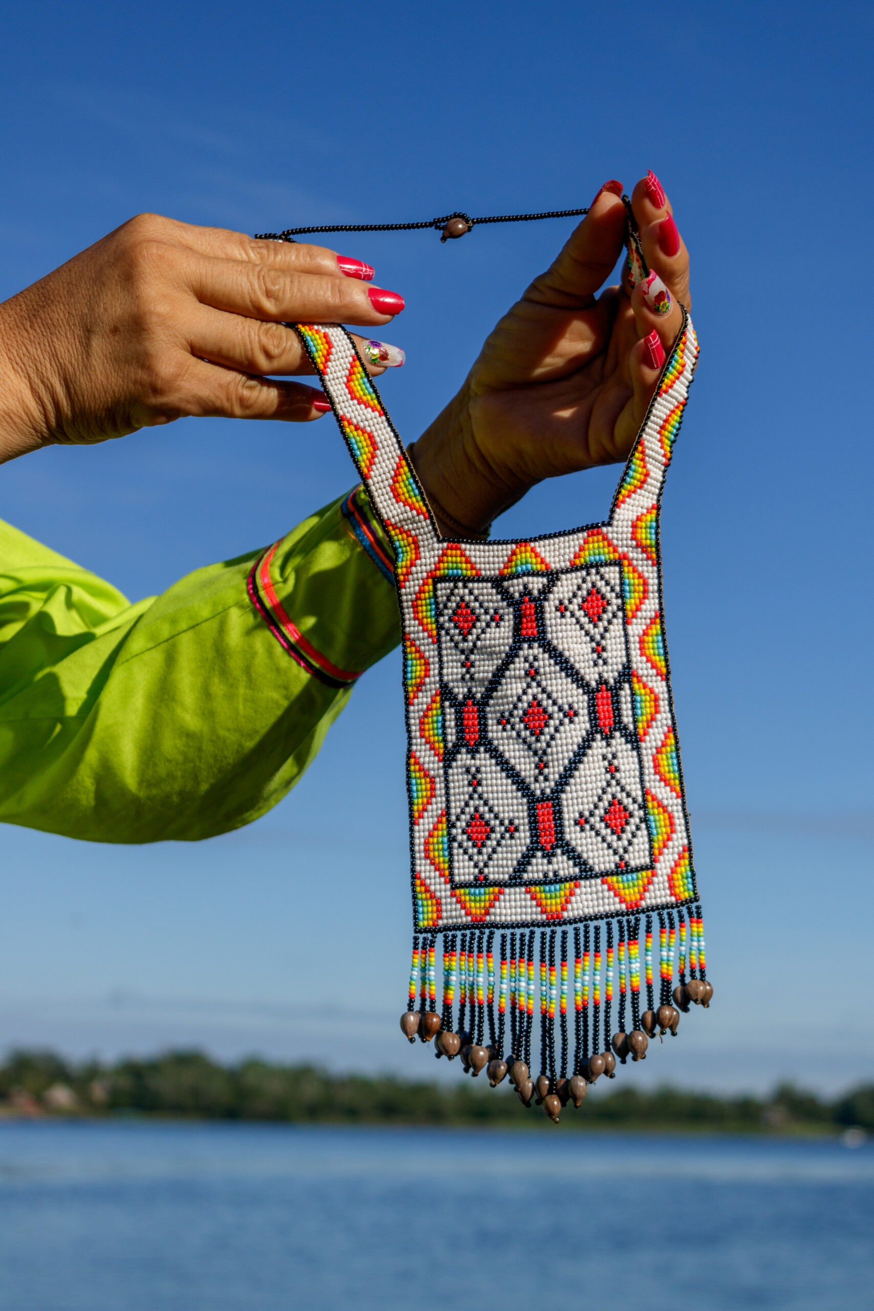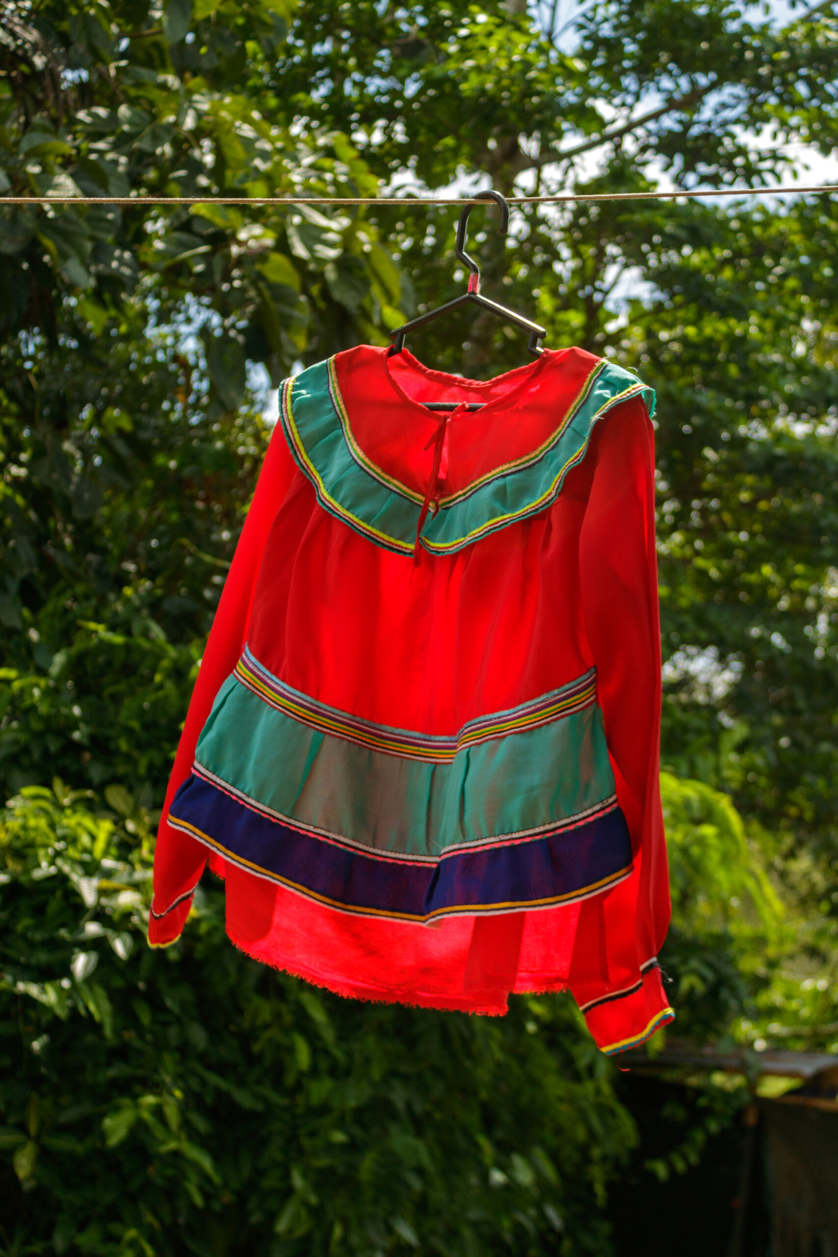 Y los colores identificamos por la lucha de nuestro territorio, la sangre de los conflictos. Hay derrames de sangre cuando hay pelea. Cuando entra la minería ilegal hay conflictos, matanzas, ¡hay muertes! Valoramos mucho nuestra cultura, nuestro territorio para poder cuidarlo. Es lo que significa nuestros diseños,” explica Graciela.
