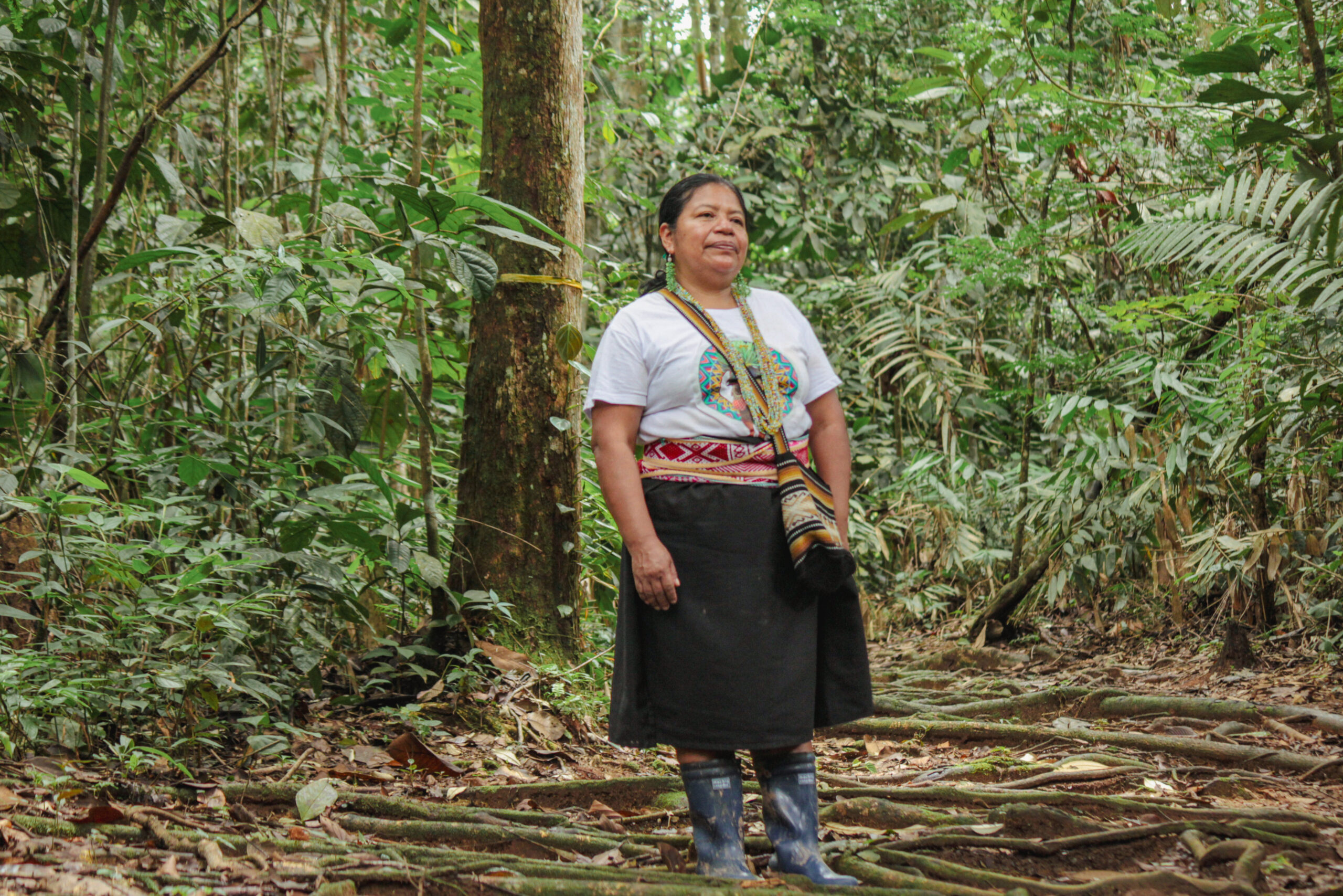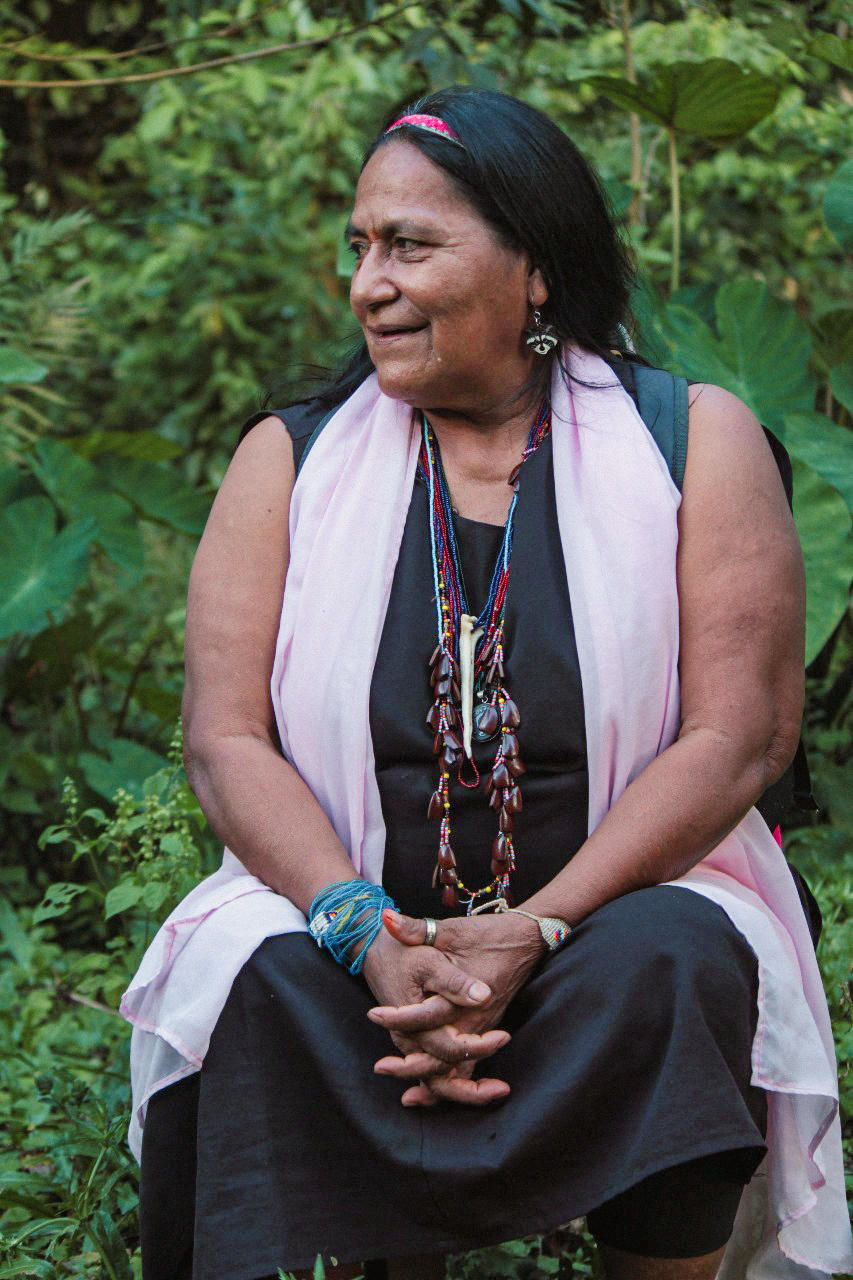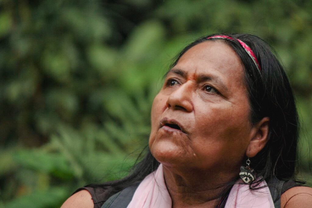 Mi madre, Conchita, decía, “Siempre que camines el territorio aprende a leerlo para que aprendas:” Si uno camina los árboles se sostienen con sus raíces, se construyen estas redes de sus raíces y se sostienen entre sí, se abrazan entre sí. Un árbol más grande sostiene el más pequeño. Desde esa humildad profunda y la espiritualidad de las mujeres sabedoras, de cómo nos enseña la madre tierra a sostenernos, ayudarnos y a perdonarnos. Es la búsqueda más profunda de nosotras, reconocer, valorar y resaltar la voz de la mujer sabedora de los pueblos. La preocupación que tenemos es que algún día no tengamos agua. No solamente para la Amazonía, sino para el mundo. Habrá tal vez cantidad de agua, pero ya no va a ser óptima para el consumo. Como somos una planta en cualquier momento, así como cuando nuestros árboles se les debilitan sus raíces y empiezan a marchitarse y a caerse sus hojas. Así mismo será el ser humano que lentamente iremos perdiendo nuestra vitalidad para continuar existiendo”.