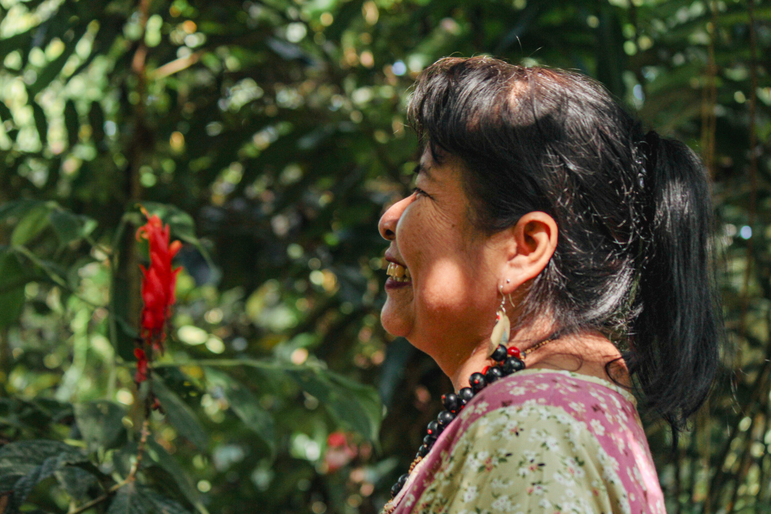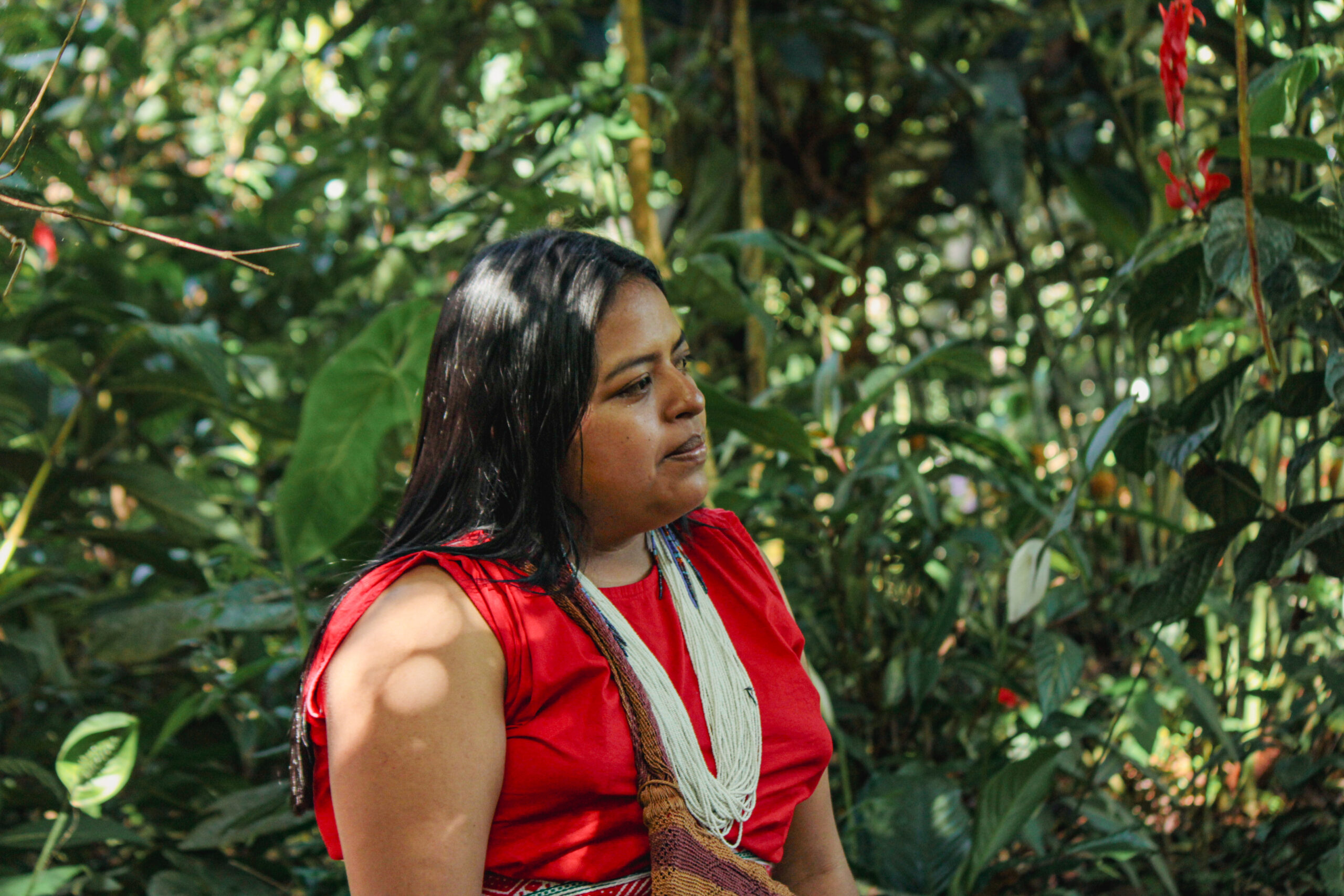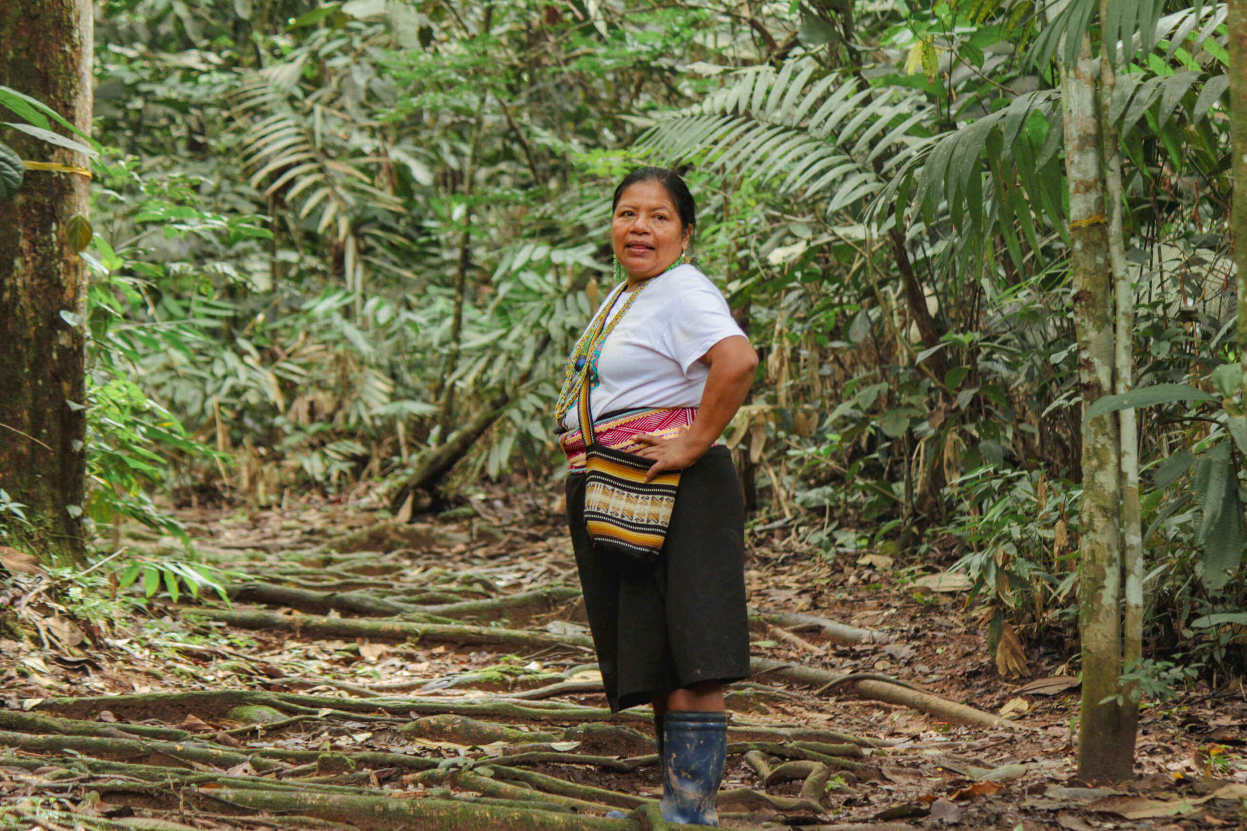 Mi madre, Conchita, decía, “Siempre que camines el territorio aprende a leerlo para que aprendas:” Si uno camina los árboles se sostienen con sus raíces, se construyen estas redes de sus raíces y se sostienen entre sí, se abrazan entre sí. Un árbol más grande sostiene el más pequeño. Desde esa humildad profunda y la espiritualidad de las mujeres sabedoras, de cómo nos enseña la madre tierra a sostenernos, ayudarnos y a perdonarnos. Es la búsqueda más profunda de nosotras, reconocer, valorar y resaltar la voz de la mujer sabedora de los pueblos. La preocupación que tenemos es que algún día no tengamos agua. No solamente para la Amazonía, sino para el mundo. Habrá tal vez cantidad de agua, pero ya no va a ser óptima para el consumo. Como somos una planta en cualquier momento, así como cuando nuestros árboles se les debilitan sus raíces y empiezan a marchitarse y a caerse sus hojas. Así mismo será el ser humano que lentamente iremos perdiendo nuestra vitalidad para continuar existiendo”.