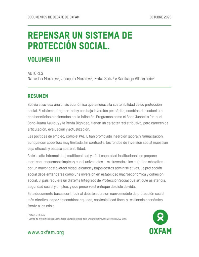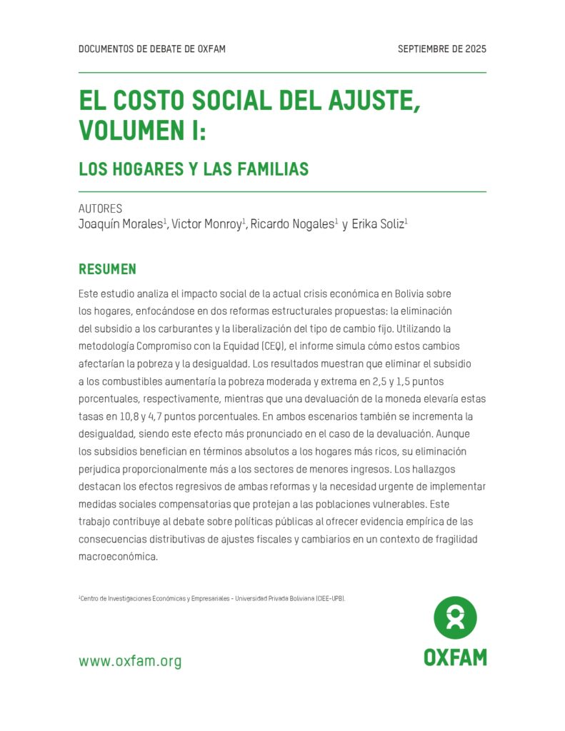 Oxfam en Bolivia presenta tres Documentos de Debate sobre “El costo social del ajuste”, una trilogía de estudios que analiza los impactos sociales de la actual crisis económica en el país y plantea alternativas para una transición económica con justicia social.